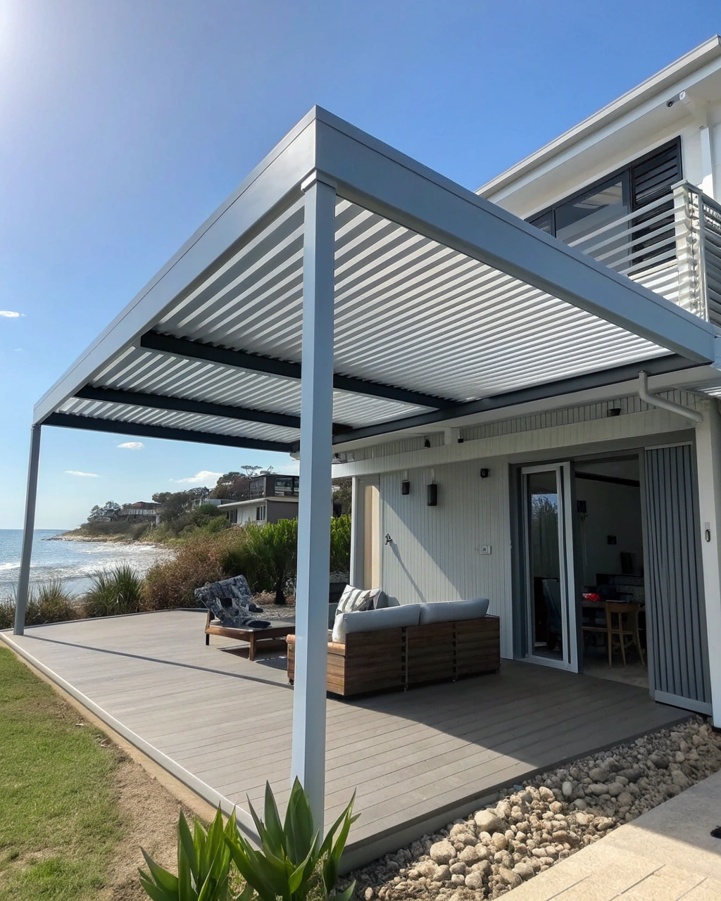 Bilinga’s coastal position exposes outdoor areas to rapid weather shifts — brilliant morning sun followed by afternoon squalls, persistent salt-laden winds, and a summer humidity that makes unshaded outdoor spaces largely unusable during peak hours. A louvred roof pergola addresses each of these conditions through adjustable blade technology that puts control directly in the hands of the homeowner.
